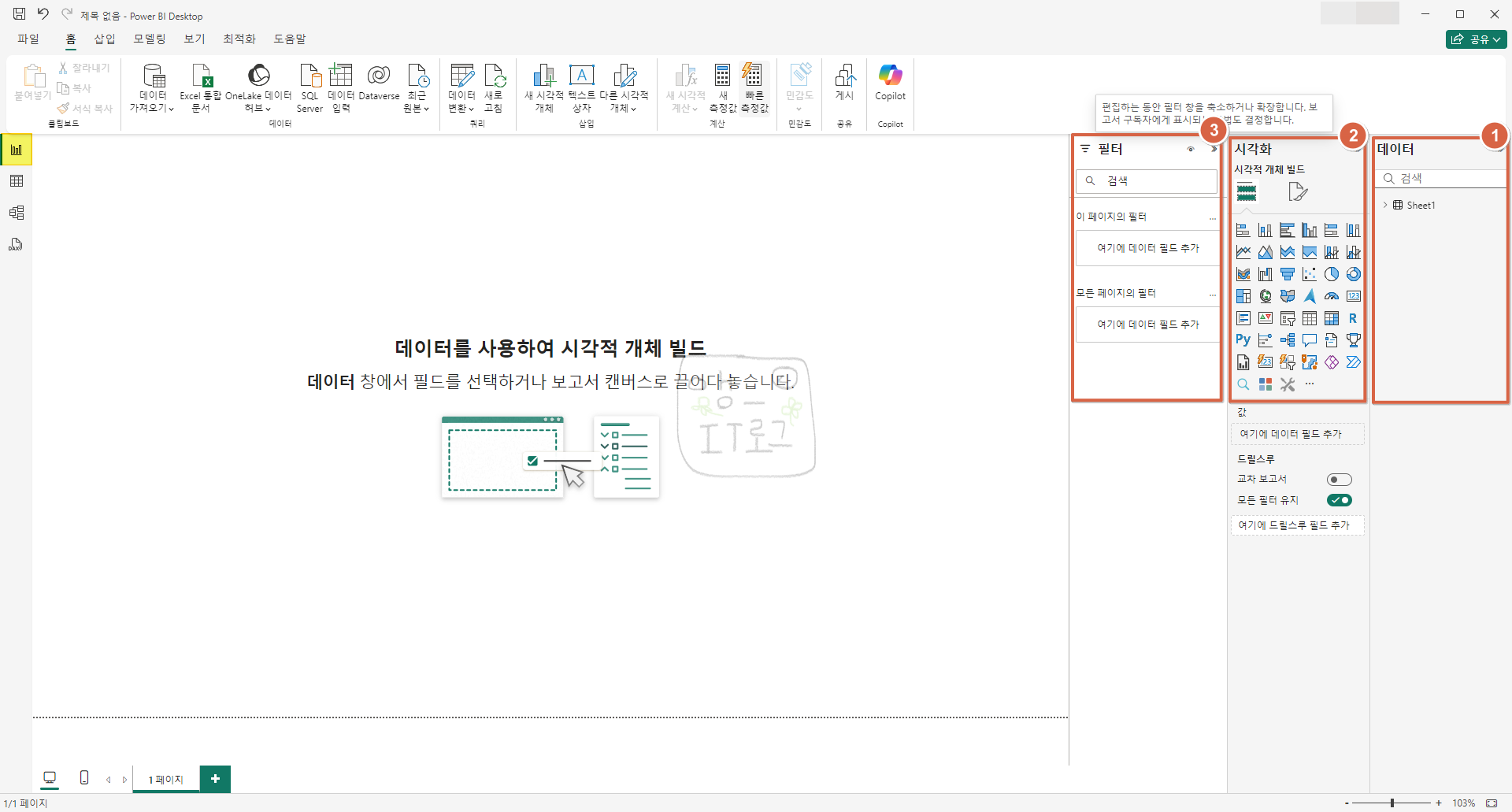 - 필터 창: 필터 창에서는 보고서에 적용할 필터를 설정할 수 있습니다. 특정 데이터에 대한 분석을 원할 때 유용합니다.